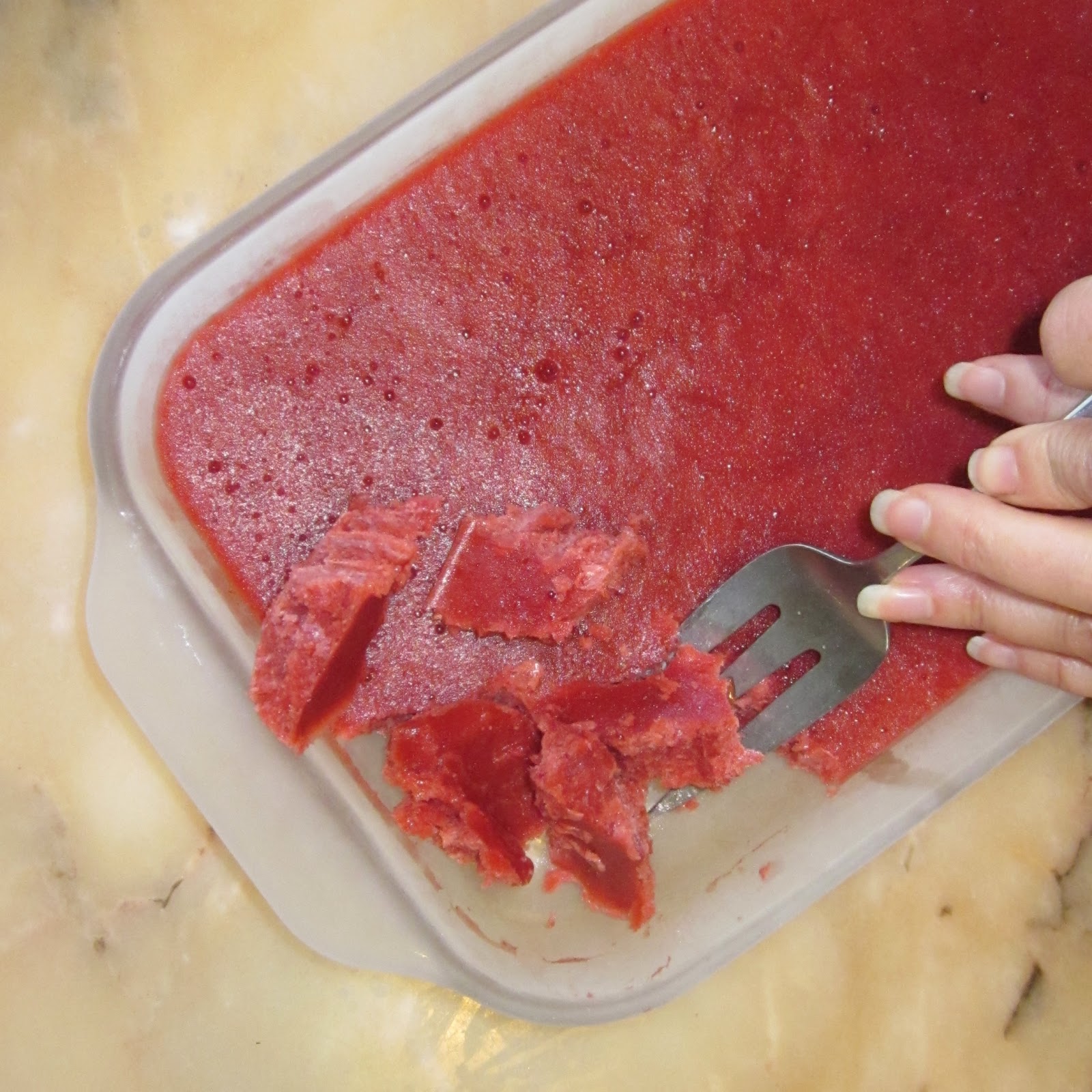 Scrape the mixture into a shallow pan, cover, and freeze until hard, 3 to 4 hours.